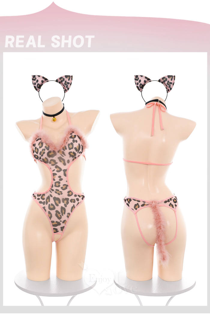 | 貓咪角色扮演服!粉紅豹紋毛絨飾胸鏤腰露臀開襠連身衣三件組