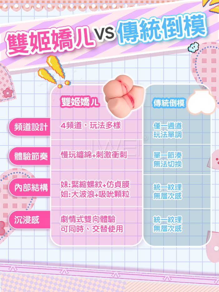4通道玩法多樣,慢玩纏綿+刺激衝刺,妹:緊縮螺紋+仿貞膜;姐:大波浪+吸吮顆粒