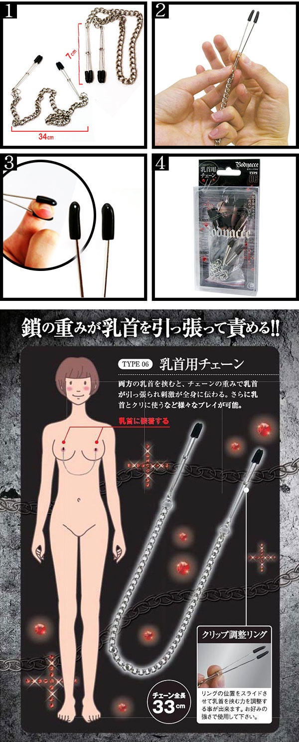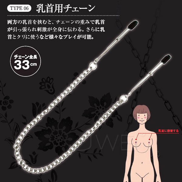 乳首をクリップで挟み、それぞれをを繋ぐ金属製のチェーンです。