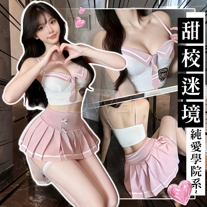 甜心刑警.胸前交叉繫帶清純百褶透視白紗COS制服套裝【上衣+短裙-粉+白】