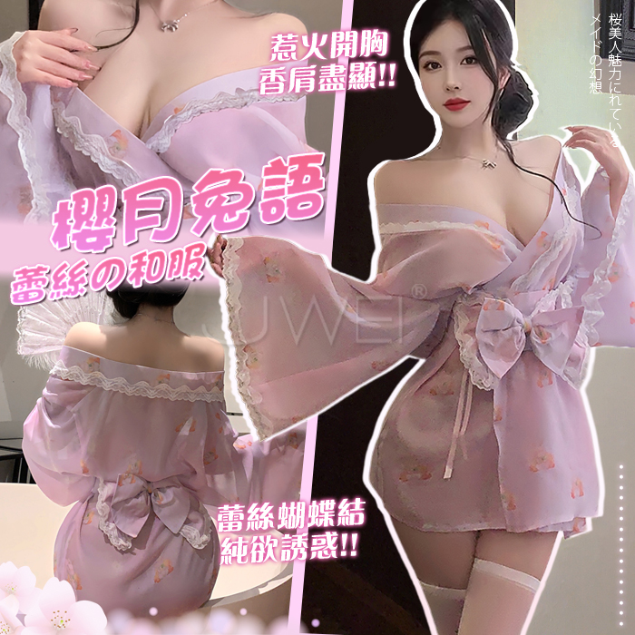 櫻月兔語.蕾絲滾邊露肩領口可愛兔子印花日系和服套裝【和服+蝴蝶結腰封】