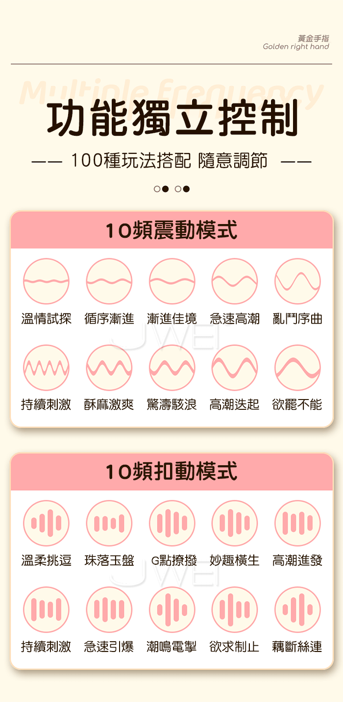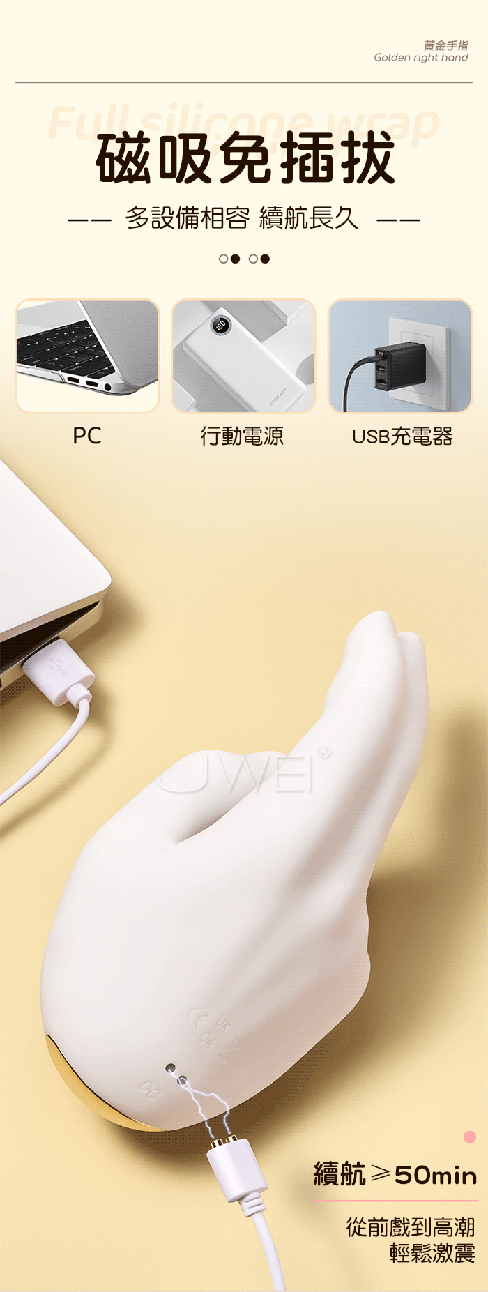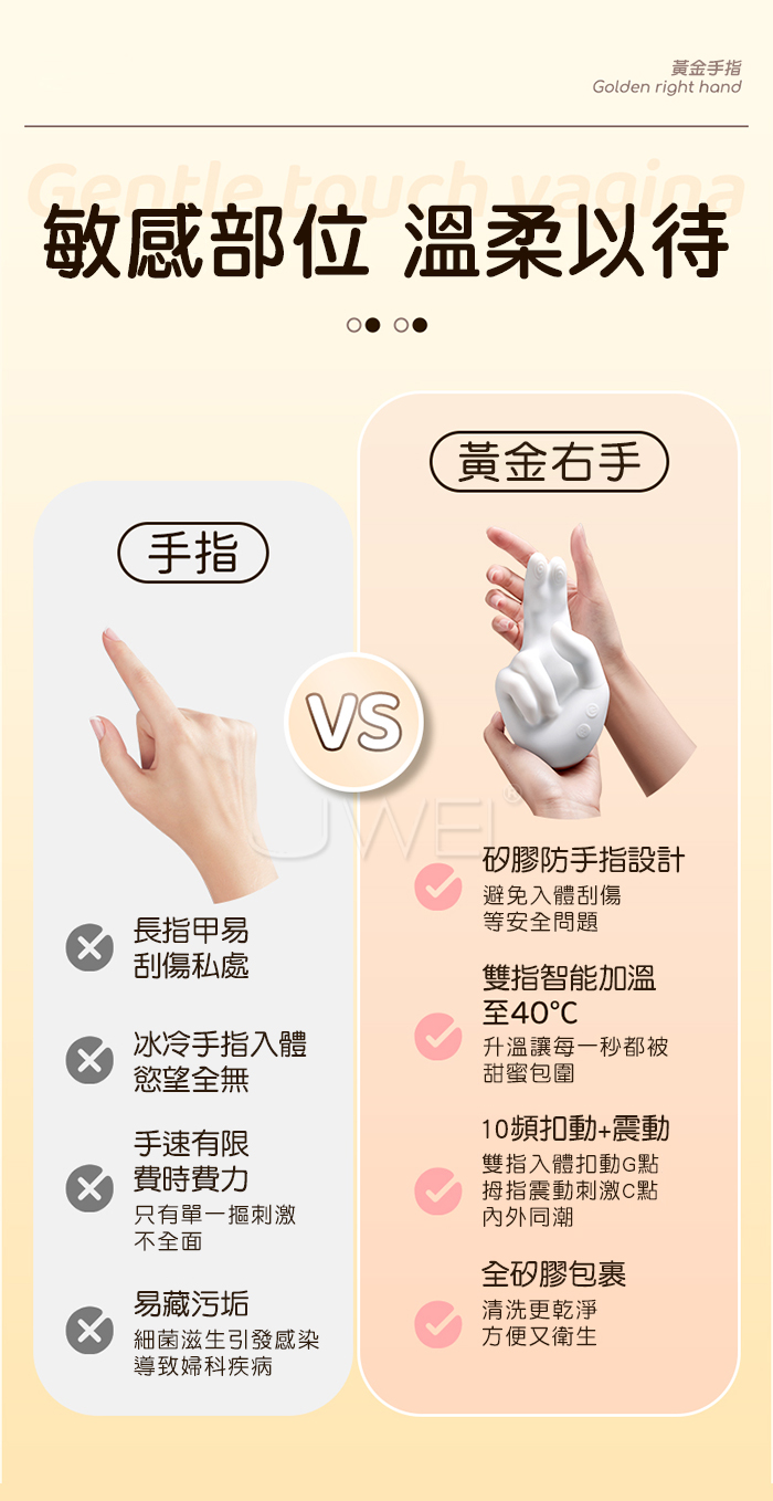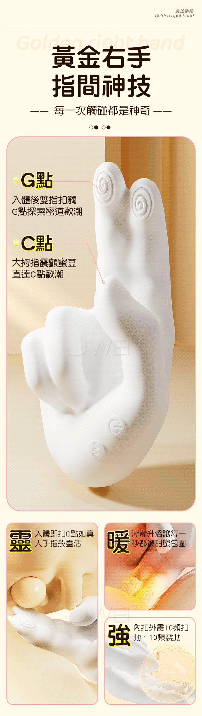 黃金右手指間神技,每一次觸碰都是神奇,精研人體工學,直切G點的黃金曲線 一扣一壓,100種玩法~拇指壓震C點,雙指上翹45度直頂攪動G點,一個都不放過! 智能加溫科技,漸漸升温每一刻都被關愛。 產品規格 ■材質: ABS+矽膠 ■規格: 詳如圖片標示 ■特色: 10頻摳動、10頻震動、加溫