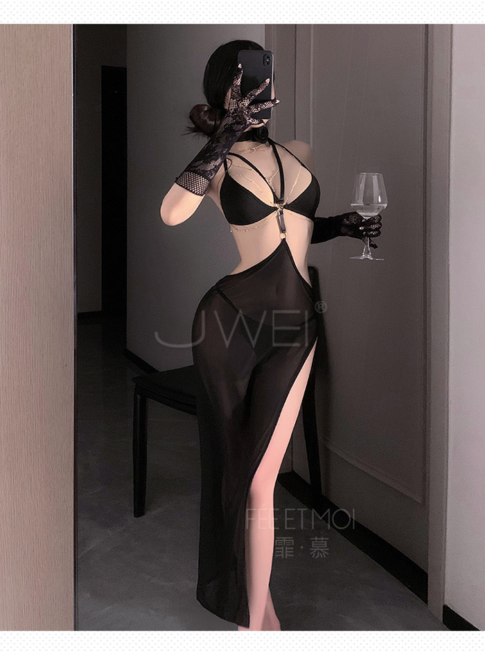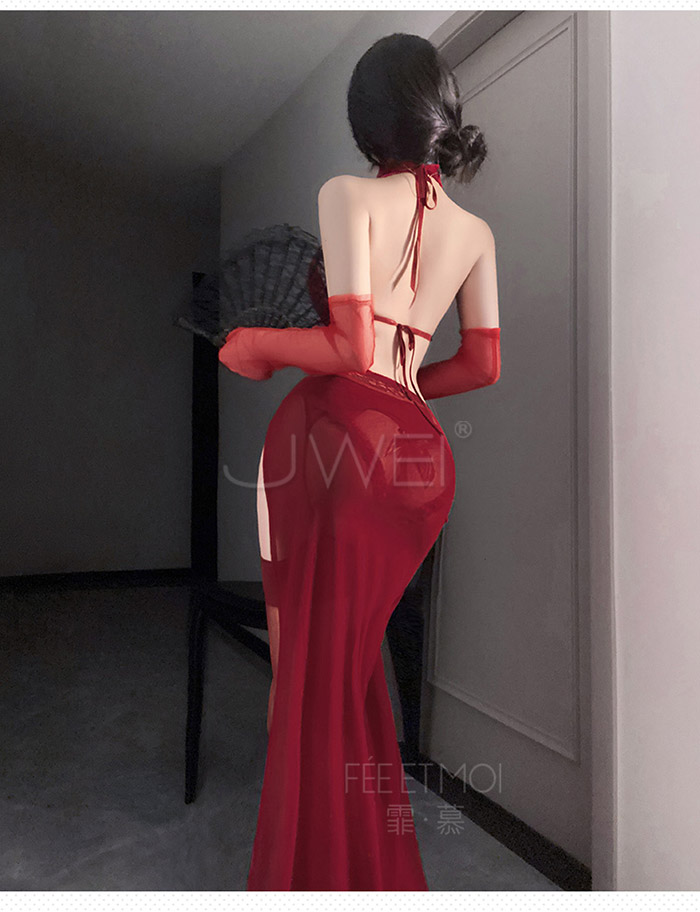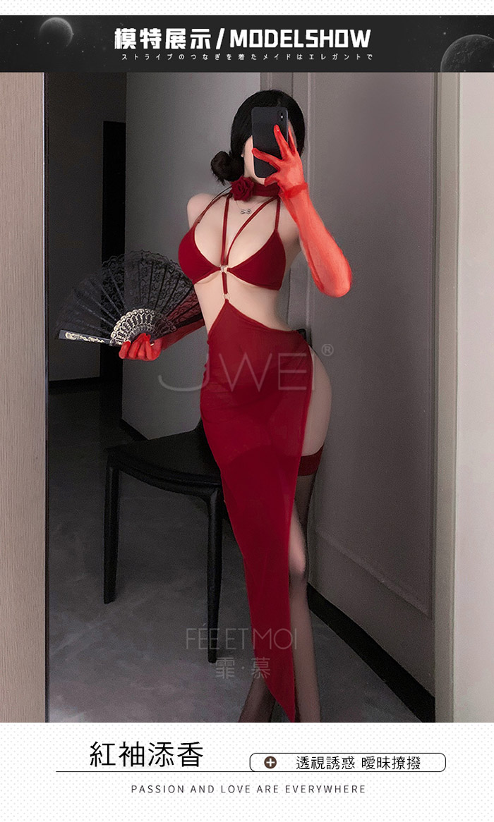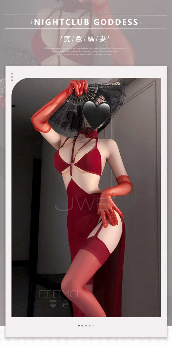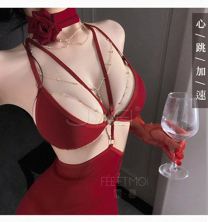 首頁>雙色嬌妻.迷迭花樣掛脖頸環美背側高衩網紗睡裙-紅【頸環+連身裙+內褲】