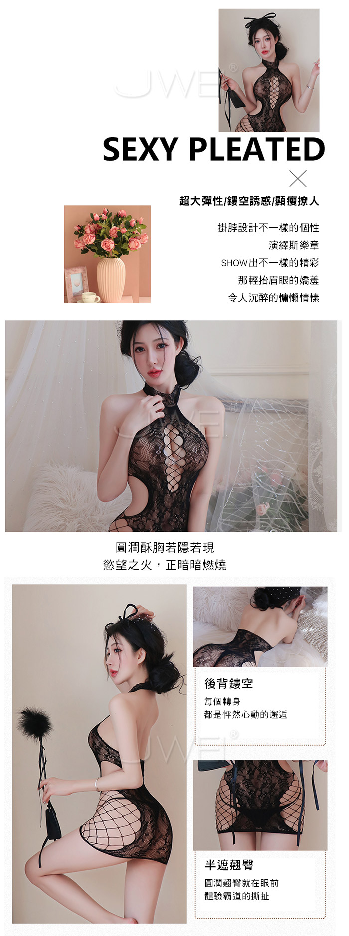 | 調情殺手.慾感花邊掛脖鏤空露溝誘惑包臀網衣