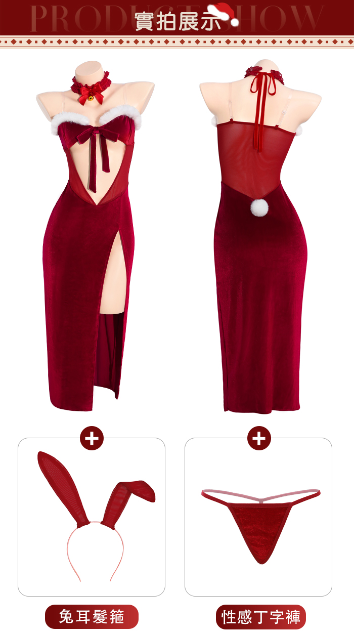 ►您現在的位置:首頁>聖誕魅力/新年狂歡派對!兔耳毛絨蝴蝶結中空禮服|側開高衩性感長裙六件式套裝