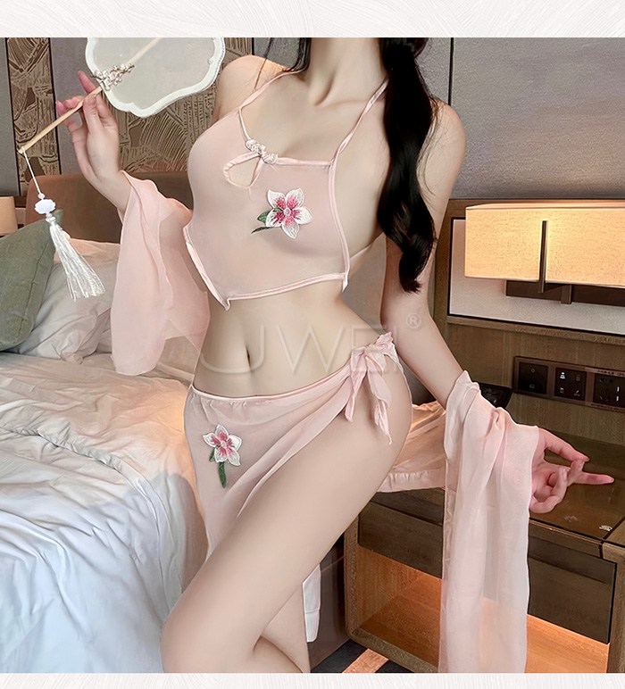 | 霓裳魅影.薄紗透視美背繫帶古風舞姬肚兜套裝【肚兜+短裙+披肩-粉色】