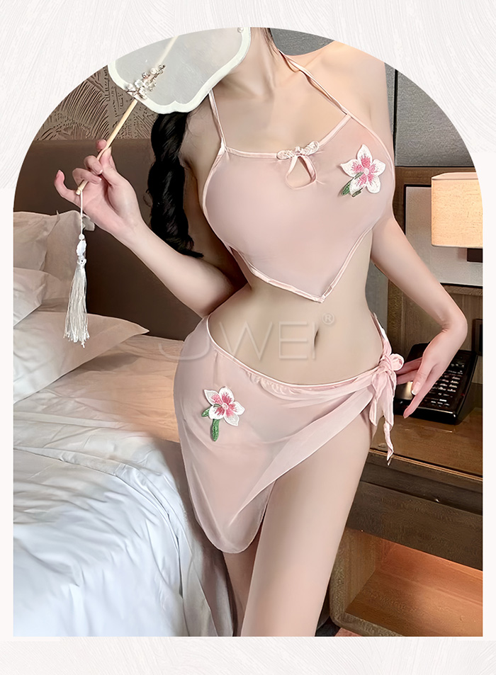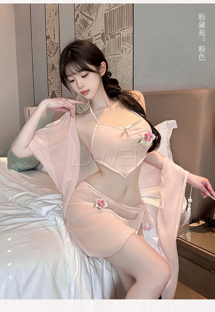 ►您現在的位置:首頁>霓裳魅影.薄紗透視美背繫帶古風舞姬肚兜套裝【肚兜+短裙+披肩-粉色】